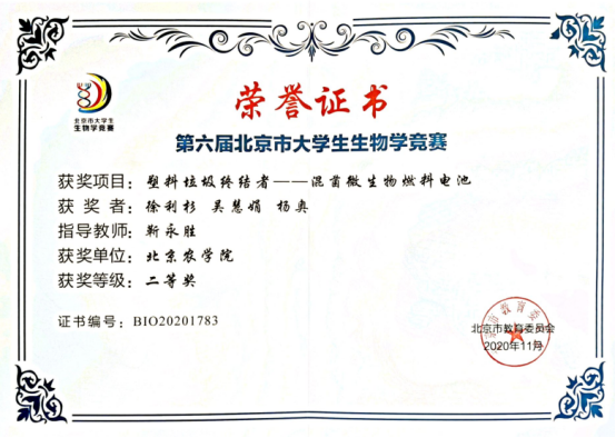 靳永胜老师指导的“塑料垃圾终结者——混菌微生物燃料电池”,获得市级二等奖。
