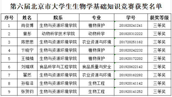 “北京市大学生生物学基础知识竞赛”中,我校共有61名同学参加机试,根据成绩排名,其中9名同学获得市级三等奖。
