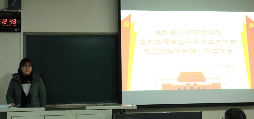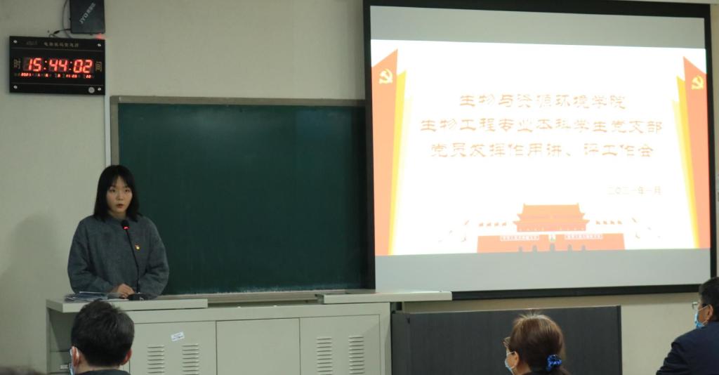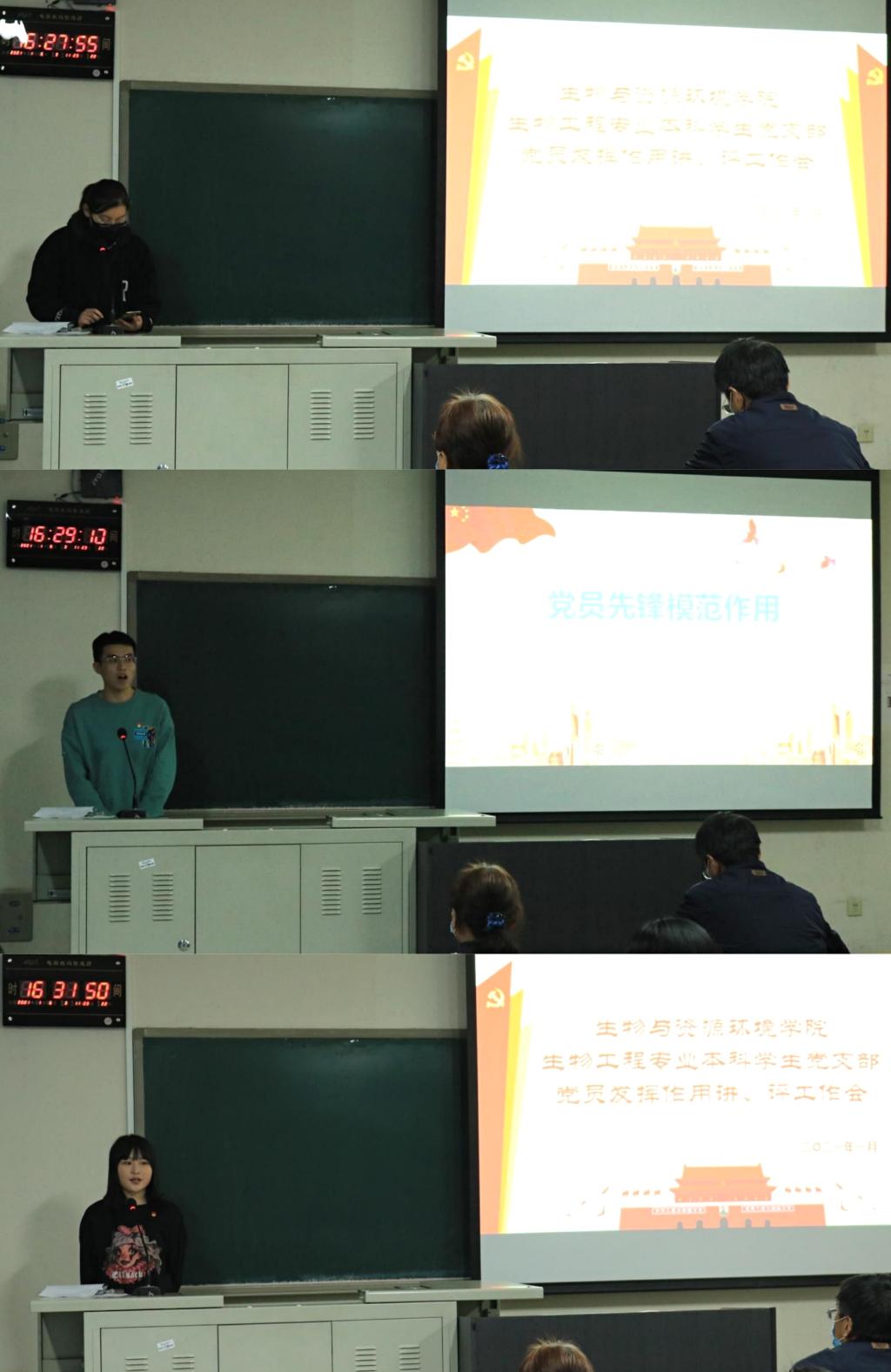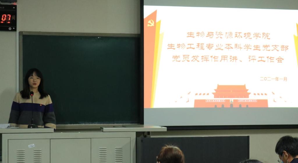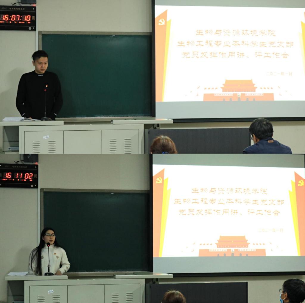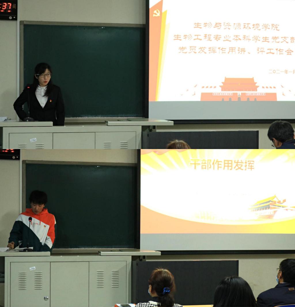 预备党员全修治平介绍了他参加生物工程1班团日活动的情况,他用习近平总书记在国家公祭日的讲话对生物工程1班进行了思想指导工作,并指正了在参加团日活动过程种发现的一些问题;预备党员刘诗园结合自己的学习经验对生物工程专业的学生进行了朋辈指导,讲解了考试的重点题型。点评人生物工程2班班长甄磊就一学期以来,党支部积极为班级同学进行学业、生活以及思想素质的引领与指导表示感谢,并表明在今后的日子里积极向党组织学习,做好班级建设建设。