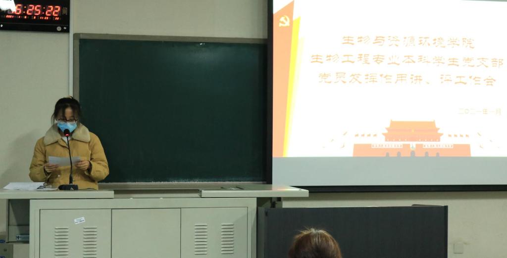 2021年1月6日,生物工程专业本科党支部在教学楼B座106举办党员作用发挥讲评活动,活动以“党员讲述自身先锋模范作用发挥和服务对象点评”的形式开展,旨在引导学生党员强化党员身份,增强党员意识,主动担当作为,更好地发挥先锋模范作用。出席本次会议的有:校党委副书记高喜军,学院党总支书记袁中立,学院党总支副书记、院长马兰青,学院党总支副书记、副院长俞涛,学院学生党支部书记高亭豪、汪丽、赵筱萌、毕扬、梁琼,以及生物工程专业本科学生党支部全体党员、部分积极分子。会议由支部党员朱梦军主持。