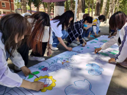 活动面向北京农学院全体学生,活动地点为体育场西侧路边,参与活动的同学在活动处领取一只涂鸦笔,在工作人员提前绘制好的画布上进行填色,并签名留念。活动现场共幅画布,一幅是同学们自主涂鸦写有“推动绿色发展,促进人与自然和谐共生”的画布,表达同学们对共建美好环境的憧憬与向往。另一幅是由同学们共同绘制的寓意美好生活的图画,蓝天白云青山绿水,表现人与自然和谐共生的幸福画面。