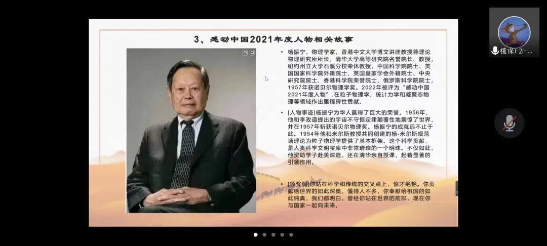 然后讲述《感动中国》优秀人物事迹,党的优秀青年人物事迹。柴旭冉同学讲述了彭士禄的人物事迹:他历经磨难,初心不改。在深山中倾听,于花甲年重启,充分体现了中华民族奋斗不息的伟大精神。毕岩同学讲了杨振宁夏明翰等的优秀事迹。王思佳同学讲述陈望道的优秀事迹。长思薇同学讲述顾诵芬的优秀事迹。