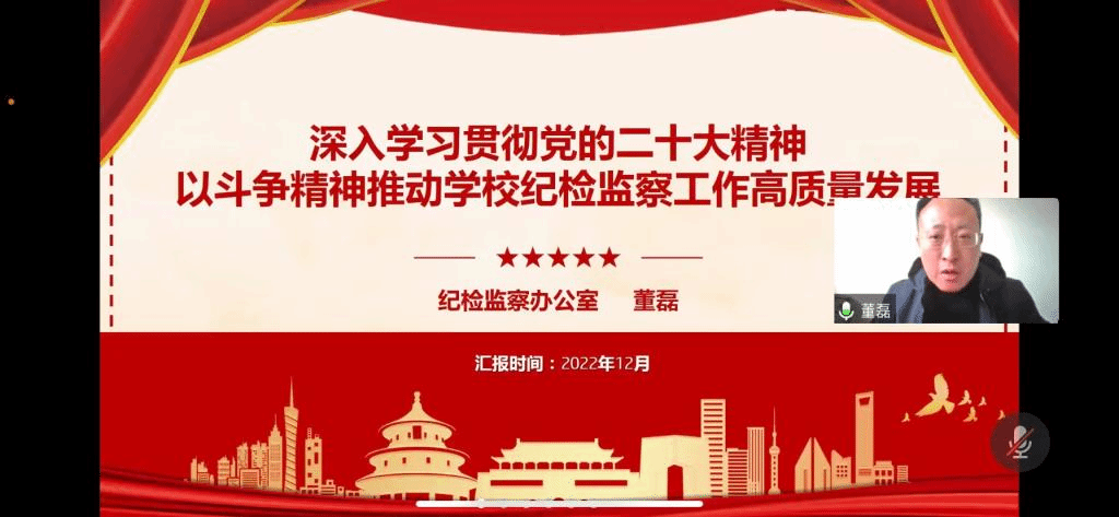 董磊以“深入学习贯彻党的二十大精神,以斗争精神推动学校纪检监察工作高质量发展”为题。围绕党的二十大重大意义、党的二十大报告文本结构和叙事逻辑、敢于斗争,善于斗争,正风肃纪,反腐惩恶、坚持斗争精神推动学校纪检监察工作高质量发展四个方面为WorldCup博彩