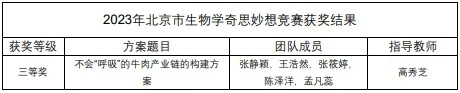 本届奇思妙想竞赛主题聚焦节能减排“用生物技术助力碳中和”,北京市共有 14 所高校 35 支团队参赛。我校通过校外专家盲审,选送的3项作品参赛,其中食品科学与工程学院高秀芝老师指导的作品获得三等奖。