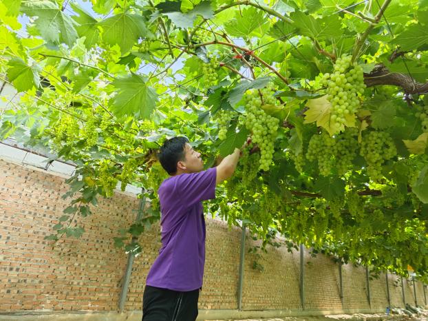 夏天气温较高,光照强烈,作物易出现徒长的现象,这时就需要及时对作物进行摘心。葡萄摘心可以合理调节植株体内营养物质的均匀分配和运输,使养分集中供给有效花果的需要,减少养分消耗,有效提高葡萄的坐果率。7月8日,金粟种植专业合作社刘师傅向小院学生崔武琦和欧梦喆讲解和示范了葡萄摘心的关键点。经过刘师傅耐心教导,小院学生们便开始行动起来。起初俩人的效率并不高,一旁的刘师傅继续指导道“你们别不忍心,就按照我说的方法放心大胆的剪”,经过一段时间的实践,俩人逐渐掌握了葡萄摘心的技术,干得越来越像样。“夏季这些徒长的枝条不仅影响葡萄采光,还浪费营养,你要想尽办法找这些枝条的麻烦,把它剪掉。农业劳动看似简单,其实蕴含着科学原理与自然规律,想要做好还需要实践熟练技术,并理解其中原理。