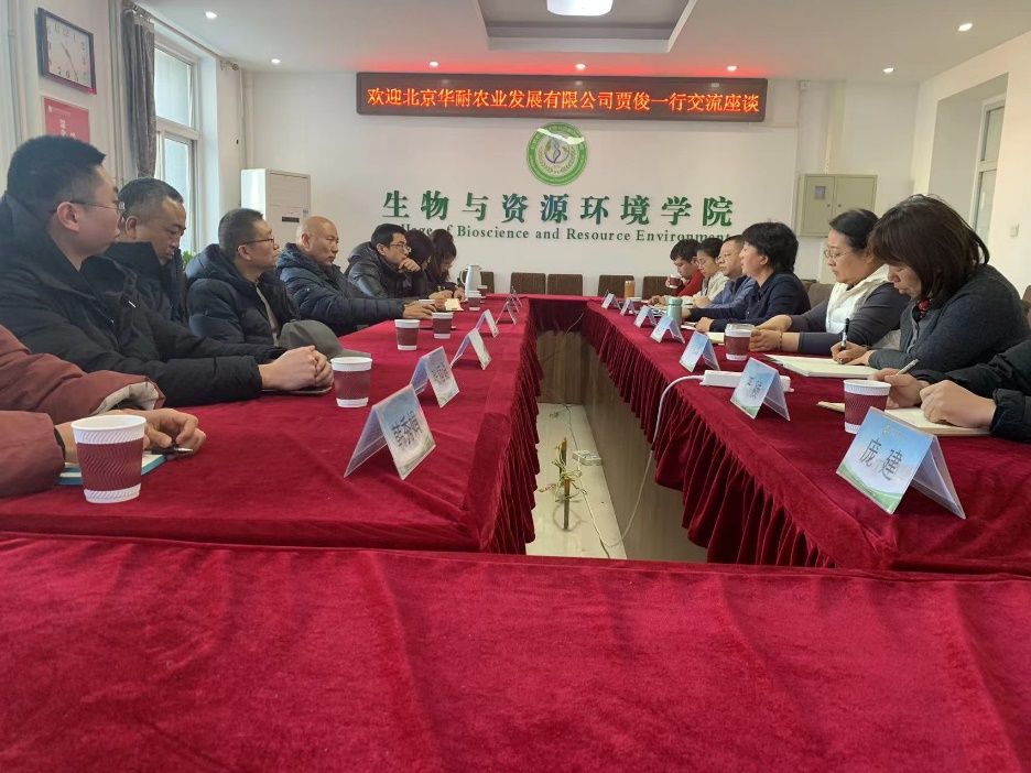 2023年12月19日,北京华耐农业发展有限公司董事长贾俊一行访问北京农学院生物与环境资源学院。学院党委书记袁中立、院长尚巧霞等参加座谈交流,双方就未来合作进行了深入沟通和探讨。