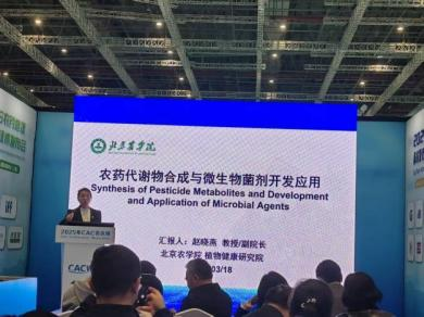 赵晓燕副院长在展会期间做主题报告“农药代谢物合成与微生物菌剂开发应用”,向海内外介绍了北京农学院植物健康研究院并探讨生物农药产业化路径及草莓等作物绿色防控的技术。此外,团队与国内外多家企业达成初步合作框架,进一步推动技术“走出去”。