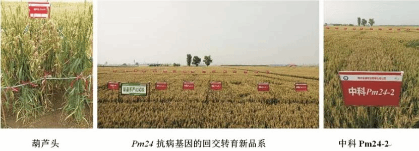 研究团队通过植物免疫学、生化实验、电生理实验和进化分析等多种方法,发现小麦中的WTK3和WTN1基因在进化过程中形成了紧密的合作关系,共同帮助小麦抵抗病原菌的入侵。具体来说,WTK3有两个重要的“功能模块”,第一模块由假激酶片段(PKF)和WTK3的第一个激酶(Kin I)结构域组成,它们的任务是识别病原菌释放的“攻击信号”-效应蛋白;第二个模块为WTK3的第二个激酶(Kin II)结构域,它的作用是衔接NLR蛋白WTN1,形成一个“防御小分队”。当感知到病原菌入侵后,WTK3-WTN1复合物迅速被激活,形成离子通道促进钙离子(Ca2+)内流,从而激活超敏反应和细胞程序化死亡。进化分析表明WTK3和WTN1在早熟禾亚科进化过程中协同进化。值得注意的是,前期研究表明Pm24(WTK3)基因为我国小麦地方品种所特有的基因资源,课题组经过多年的回交转育,已将Pm24基因导入到多个高产小麦底盘品种(图2),创制的抗病新种质已无偿发放给国内多家单位进行抗病育种利用,这些研究成果有望解决我国小麦主产区缺乏广谱抗白粉病基因资源的问题,同时为防控麦瘟病提前建立潜在的遗传屏障,为我国农业可持续发展和产业升级提供重要的理论和技术支持。