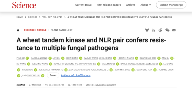 青年教师李晶等人在Science发表题为“A wheat tandem kinase and NLR pair confers resistance to multiple fungal pathogens”的研究论文,揭示了串联激酶抵御病原菌入侵的全新免疫机制:一个非典型的NLR蛋白WTN1(Wheat Tandem NBD 1)与串联激酶WTK3协同识别病原菌的效应蛋白激发免疫反应,表现对多种小麦真菌病害的抗性。该项工作突破了领域内对串联激酶作用机制的认识,发现了串联激酶与传统NLR协同抗病新范式,填补了植物串联激酶免疫调控途径的空白,为作物广谱多抗品种精准设计奠定了理论和应用基础。