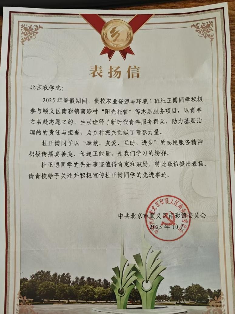 杜正博在“阳光托管”项目中践行志愿精神,传播真善美与正能量。他秉持为社会做贡献的思想参与志愿活动,在活动中帮助村民疏通下水道、照看老人和小孩。在这次活动中,其先进事迹获中共北京市顺义区南彩镇委员会表扬。在乡村振兴征程中,像杜正博这样的青年志愿者还有很多,他们以实际行动诠释责任担当,为乡村振兴注入青春活力,是投身乡村建设的榜样。