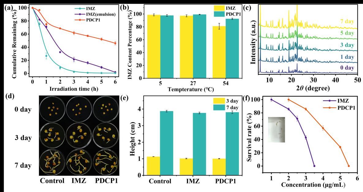 3. (a) 抑霉唑乳剂、抑霉唑溶液和 PDCP1 悬浮液的紫外线稳定性; (b) 固体抑霉唑和 PDCP1 在不同温度(527 54℃)下的热储存稳定性; (c) PDCP1 悬浮液的水稳定性测试; (d)大豆种子萌发实验和(e)幼苗高度实验; (f)以斑马鱼毒性测试。