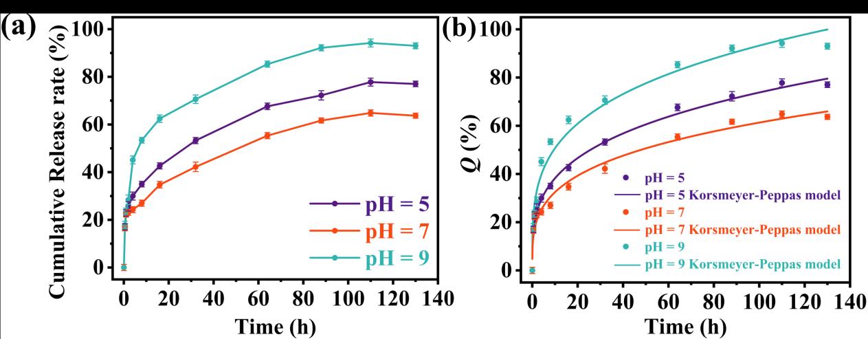2. (a) 不同 pH (57 9) PDCP1 (b) 基于 Korsmeyer-Peppas 动力学释放模型的累积释放率。