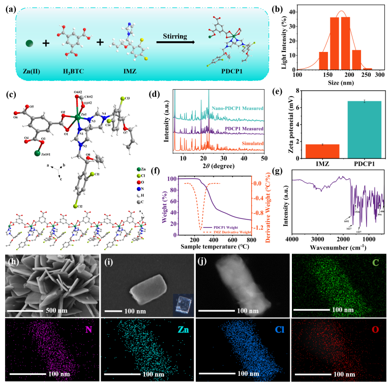 1. (a) PDCP1 合成; (b) DLS分析; (c) PDCP1 的配位环境及链结构; (d) 模拟和实验PXRD; (e) zeta电位; (f) TGA)IMZ DTG; (g) FT-IR; (h,i) SEM; (j) TEM, 碳、氮、锌、氯和氧EDS mapping