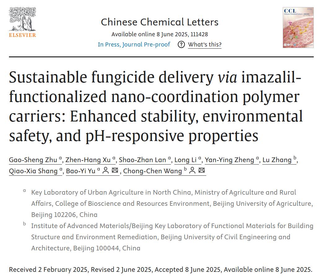 近日,WorldCup博彩平台推荐 农药创制与应用团队在CHINESE CHEMICAL LETTERS(中科院1区,顶刊,IF = 8.9)上发表了题为Sustainable Fungicide Delivery via Imazalil-Functionalized Nano-Coordination Polymer Carriers: Enhanced Stability, Environmental Safety, and pH-Responsive Properties的研究论文。论文以北京农学院为第一完成单位,WorldCup博彩 硕士研究生朱高生为第一作者,应用化学系于宝义副教授和王崇臣教授为通讯作者,尚巧霞教授给予了具体指导。本研究得到了北京市设施蔬菜创新团队项目(BAIC01)和都市农林学新兴交叉学科平台建设项目资助。