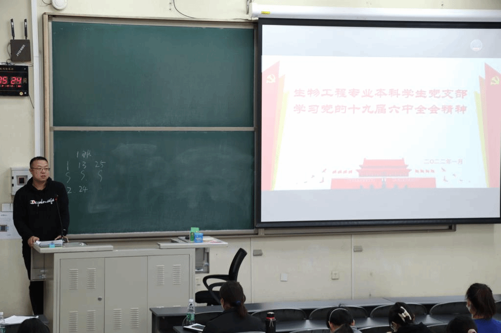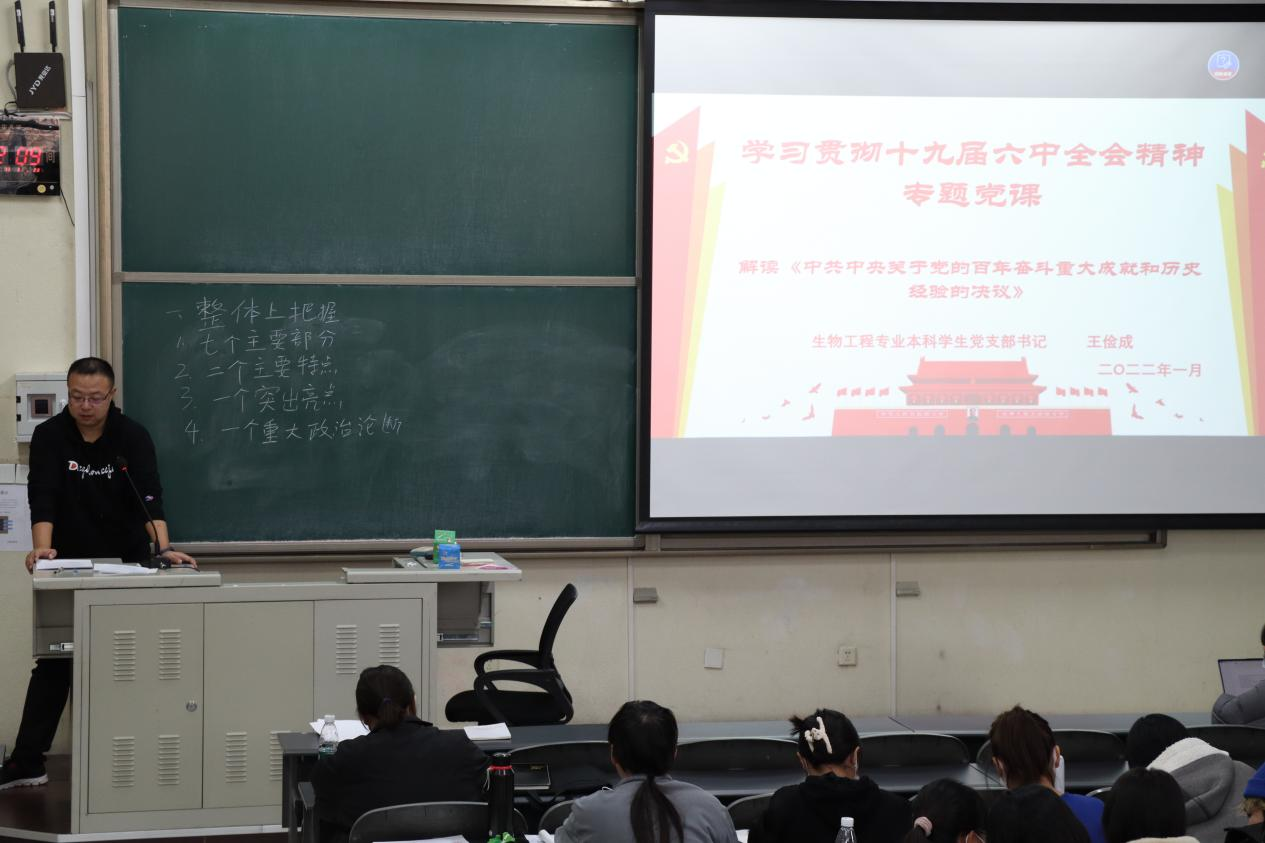 1月5日下午,生物工程专业本科学生党支部在教学楼B座401组织召开专题学习会,深入学习贯彻十九届六中全会精神。全体党员和积极分子参加了本次会议,会议由党支部书记王俭成老师主持。