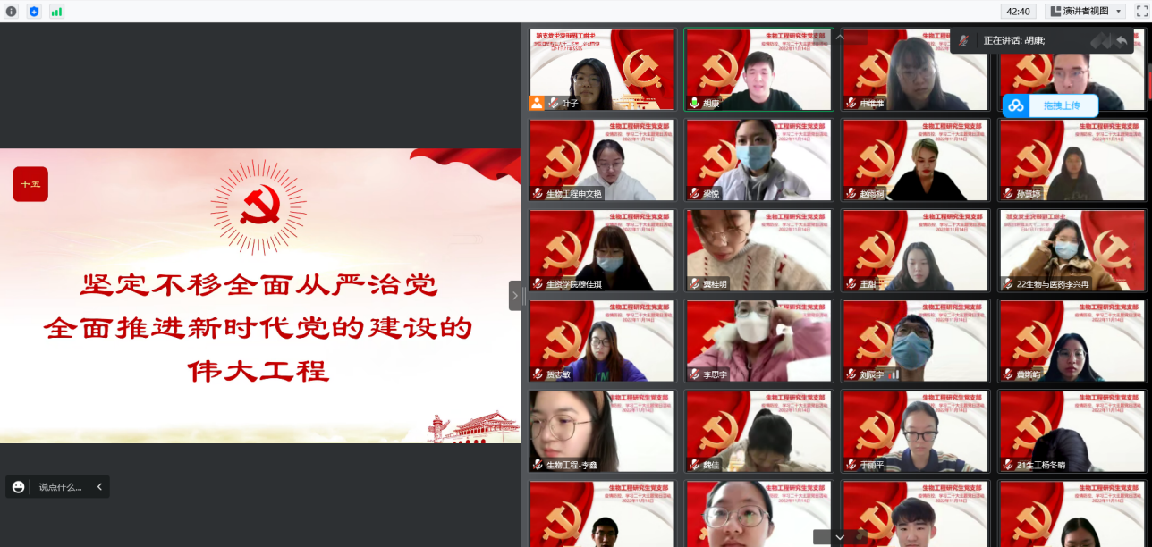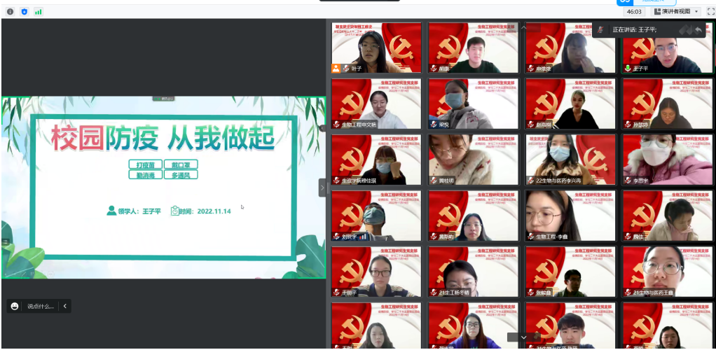 生物工程研究生党支部召开“校园防疫,从我做起”主题党日活动。支部全体党员和积极分子参会,会议由支部书记申维维主持。