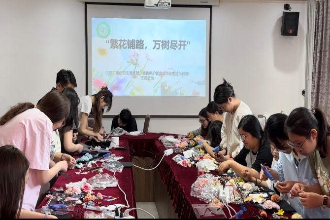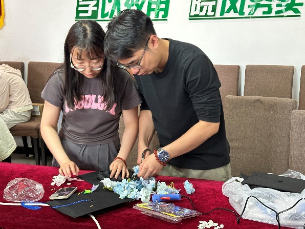 凤凰花开,毕业季悄然而至。为鼓励学生以阳光的心态迎接毕业季,给大学生涯留下更多纪念,6月3日,生物工程与植物保护研究生党支部共同开展“繁花铺路,万树尽开”主题党日活动。毕业生党员们结合专业优势,用色彩缤纷的花材设计制作独一无二的学位帽,作为难忘仲恺岁月的纪念和对未来的美好祝福。生物工程研究生党支部书记刘冰颖,植物保护研究生党支部书记申维维,2024届研究生毕业生党员与积极分子参与本次活动。