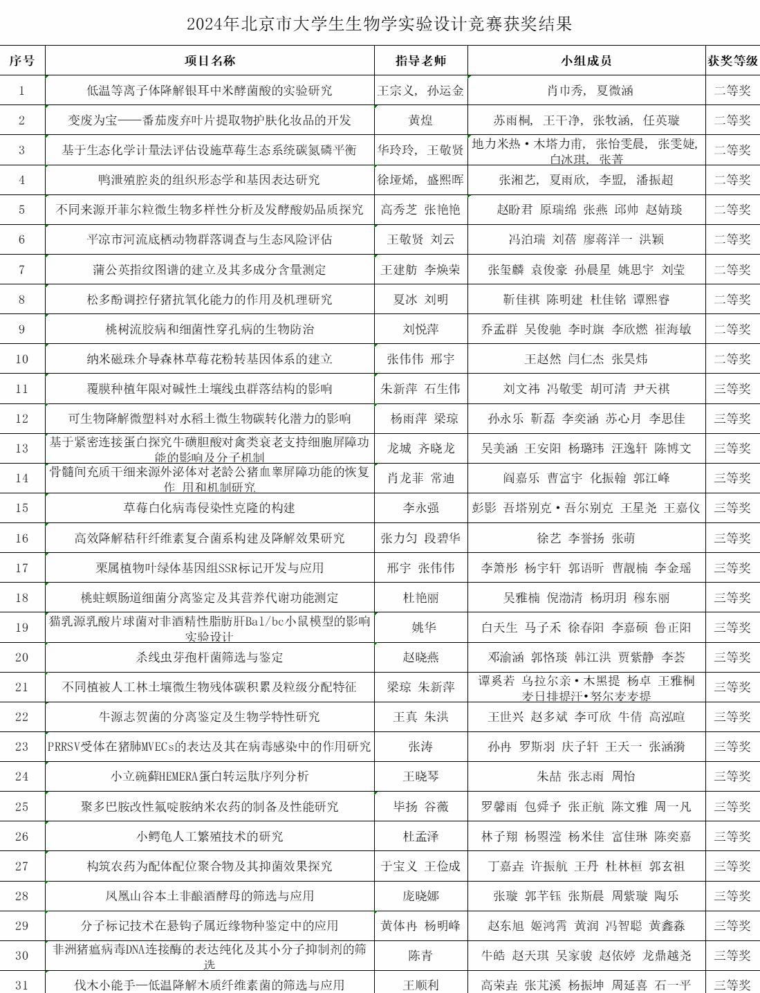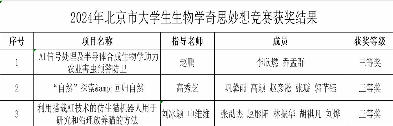 生物学实验设计竞赛围绕生命科学相关领域科学问题,开展自主实验设计并实施形成论文汇报。今年北京市共有20所高校276支有效团队参与实验设计竞赛,经过网络初评,评选出排名前50名的团队进行决赛答辩。通过网络评审、现场展示、评委问答等环节,我校共计31支团队获奖,10支团队荣获二等奖,21支队伍荣获三等奖。