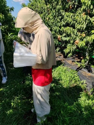 顶着近40度的高温,实践团来到了寅洞村国桃基地。研究生按研究方案从普通土壤、桃枝粉碎还田1年、5年的土壤等几个类别中,分组进行了土壤取样,用以在实验室测试不同处理下的土壤成份和分离功能微生物等。通过“学长教学弟”模式,研究生给首次参加本次活动的本科生仔细讲解了桃枝废弃物还田的模式,涉及桃枝粉碎还田后的消毒方式,以及果园的深翻措施、腐熟过程等。实践团还调研了国桃基地不同品种的成熟情况和果实品质,调查了易感细菌性黑斑病的‘油蟠7’桃品种的树体长势,对已感病的叶片、枝条和果实进行了取样,与基地负责人交流了引进的不同桃树品种的适应性。调研发现,国桃基地引进的20多个品种,仅有‘油蟠7’出现了严重病害,其他品种没有发现感染,从实践中让学生了解了病害发生与品种特性的紧密关系,为病害机制的深入研究取得了第一手的资料。就此,团队老师对今后的引种方案提出了针对性建议。