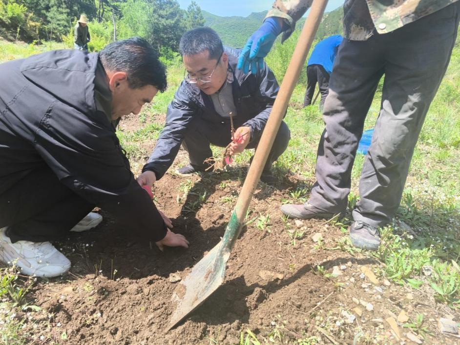 田间地头,师生们与农户一起挥锹挖坑、栽苗培土。研究生一边劳作一边与农户交流:"大叔,您看这个根系使他舒展一点放,坑再浅一点,成活率会更高。"研究生们一边栽苗,一边讲解栽培要点。"这些大学生干活踏实,讲的技术也清楚。"水头村焦书记竖起了大拇指。