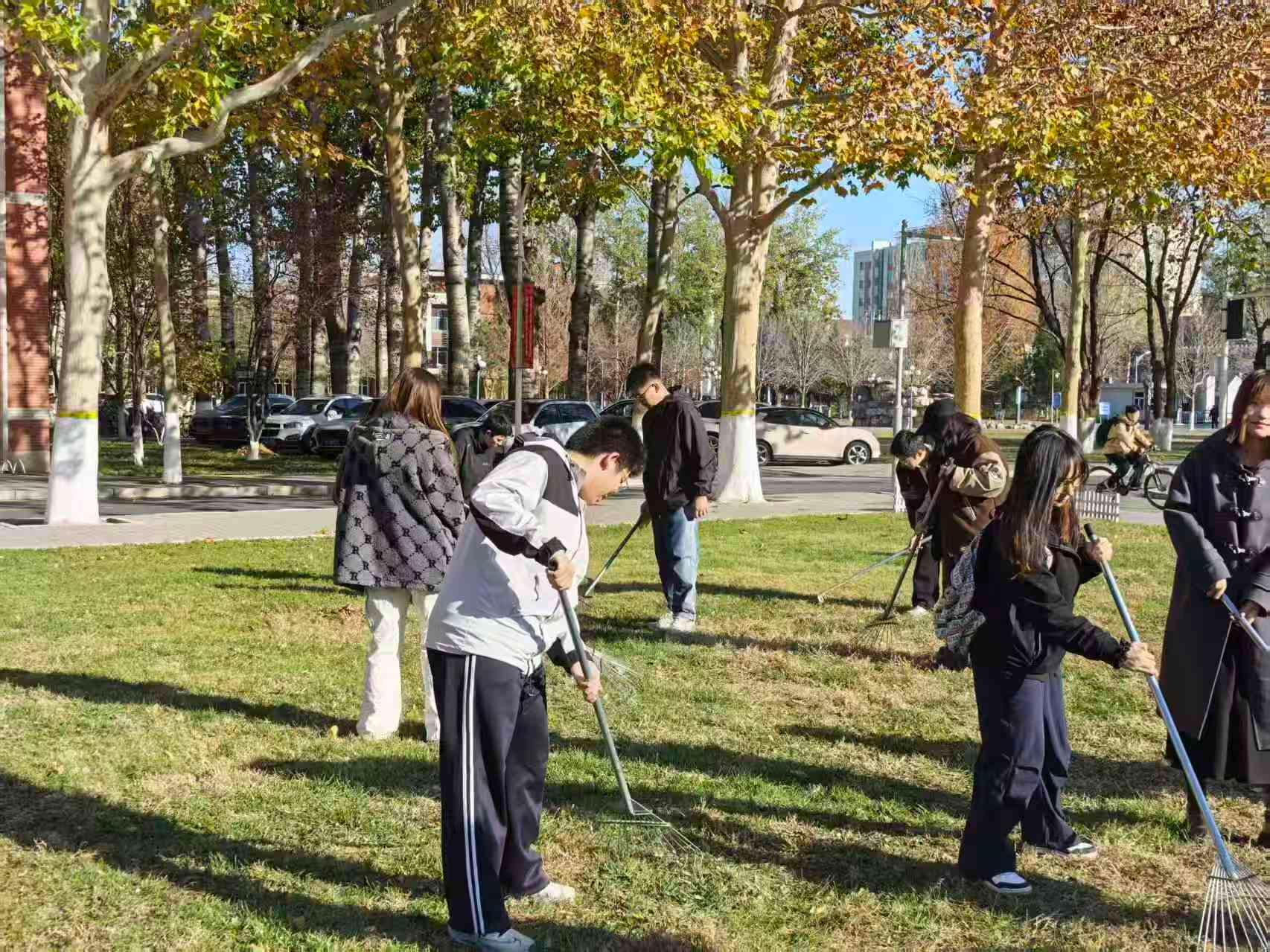 活动当天,工作人员为志愿者们发放了扫帚、垃圾袋、垃圾夹等工具,并进行了分组安排,明确了各小组的负责区域。随着一声令下,志愿者们迅速奔赴各自的责任区域,正式开启了校园清扫行动。道路两旁、绿化带中、教学楼周边,处处都能看到他们忙碌的身影。尽管秋风萧瑟,吹得树叶沙沙作响,但同学们的热情却丝毫未减,干劲十足。大家分工明确,协作默契:有的同学手持扫帚,认真清扫着堆积如山的落叶,不放过任何一个角落,将落叶扫成一堆堆,方便后续清理;有的同学则拿着垃圾袋,紧跟在清扫同学身后,迅速将落叶和杂物装进袋中,扎紧袋口,防止垃圾散落。